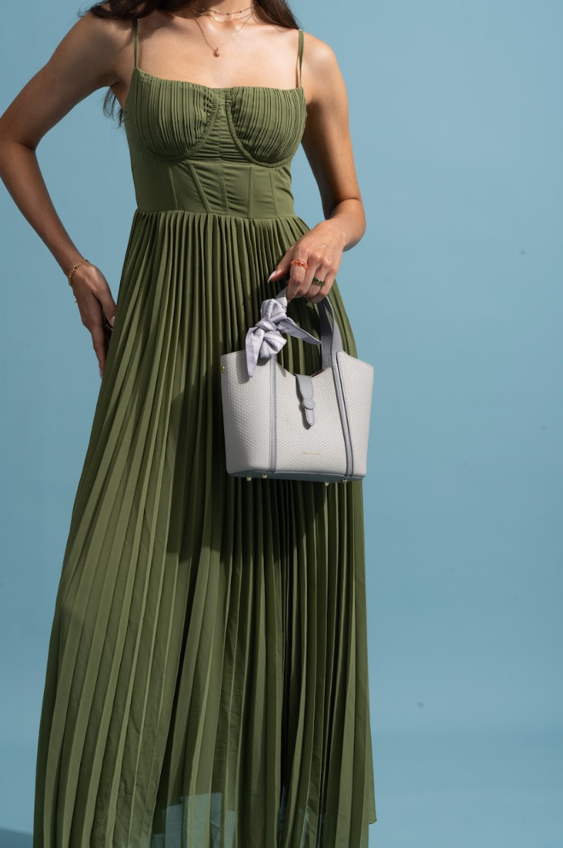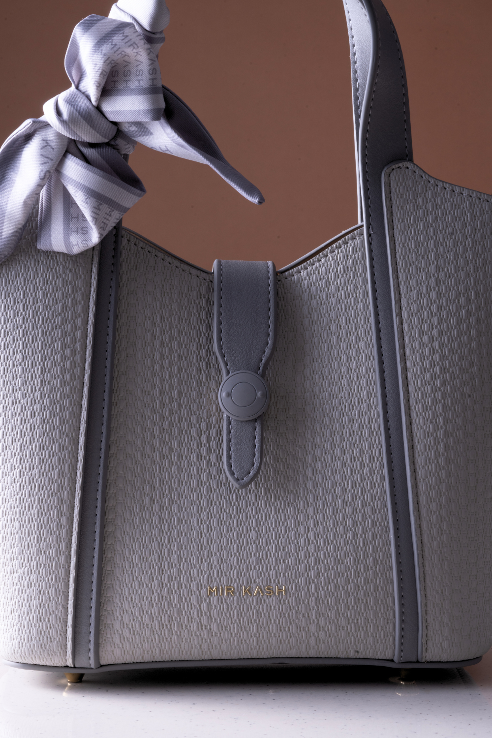 The Bucky Bag is crafted from rich vegan leather with a pebbled texture, giving it a refined look and lasting durability. With its sleek double-handle belted design, structured bucket silhouette, and roomy interior, it’s the perfect carryall for holidays, brunches, and stylish days out.
